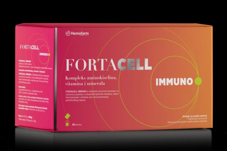 Fortacell Immuno је дијететски суплемент, који комбинује 24 нутријента – витамине, минерале и аминокиселине за свеобухватну подршку током дана. Једна кесица дневно растворена у чаши воде, уз пријатан укус поморанџе, чини га практичним избором за запослене људе који балансирају посао и породичне обавезе и желе поуздану подршку када су изложени сезонским прехладама или појачаном психофизичком напору.
