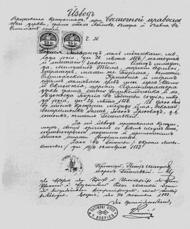 НИКОЛА Тесла је рођен 28. јуна 1856. године по старом, 10. јула по новом календару у Смиљану, као четврто од петоро деце у породици Тесла, у Војној крајини Аустријског царства. По месту рођења припадао је Првој личкој регименти - пуковнији и Медачкој компанији - чети број 9. Иако је у Смиљану била стационирана 11. чета Прве личке пуковније, он је ипак уписан где му се отац родио и где је био заведен као војни обвезник, у Радучу, где су живели граничари Медачке чете. Родитељи су поред њега имали још три ћерке - Ангелину, Милку и Марицу, и сина Данила.