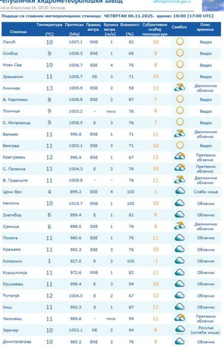РЕПУБЛИЧКИ хидрометеоролошки завод у својој најновијој објави најавио је вечерас на истоку и југу, а у току ноћи понегде и у југозападним и централним крајевима Србије облачно, местимично с кишом. На високим планинама је могућ и снег.