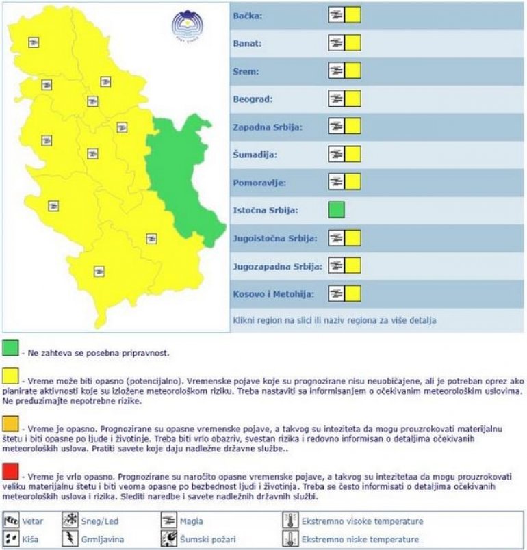 У већем делу Србије, изузев источне, данас је на снази жути метео аларм због магле. Ово упозорење значи да време може бити потенцијално опасно: Временске појаве које су прогнозиране нису неуобичајене, али је потребан опрез ако планирате активности које су изложене метеоролошком ризику. Треба наставити са информисањем о очекиваним метеоролошким условима. Не предузимајте непотребне ризике.