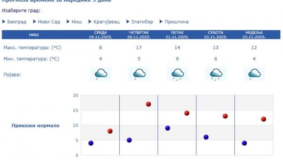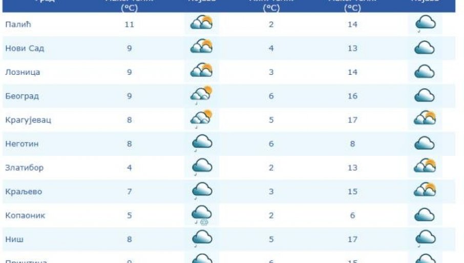 У Београду ће максимална температура ићи до 16 степени, док се у Новом Саду и на Златибору очекује 13 степени Целзијусових. Најтоплије ће бити у Крагујевцу и Нишу, где се очекује чак 17 степени!