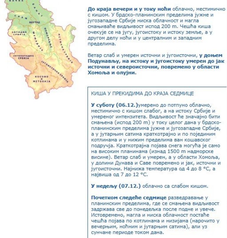 У суботу (06.12.)умерено до потпуно облачно, местимично с кишом слабог, а на истоку Србије и умереног интензитета. Видљивост ће значајно бити смањена (испод 200 m) у току целог дана у брдско-планинским пределима јужне и југозападне Србије, a у јутарњим сатима краткотрајно и по појединим котлинама и у нижим пределима ван кошавског подручја. Краткотрајна појава снега могућа је само на високим планинама (изнад 1500 m надморске висине). Ветар слаб и умерен, а у области Хомоља, у долини Дунава и Саве повремено и јак, источни и југоисточни. Најнижа температура од 4 до 8 °С, а највиша од 7 до 12 °С.
