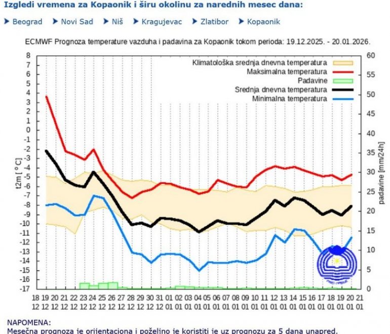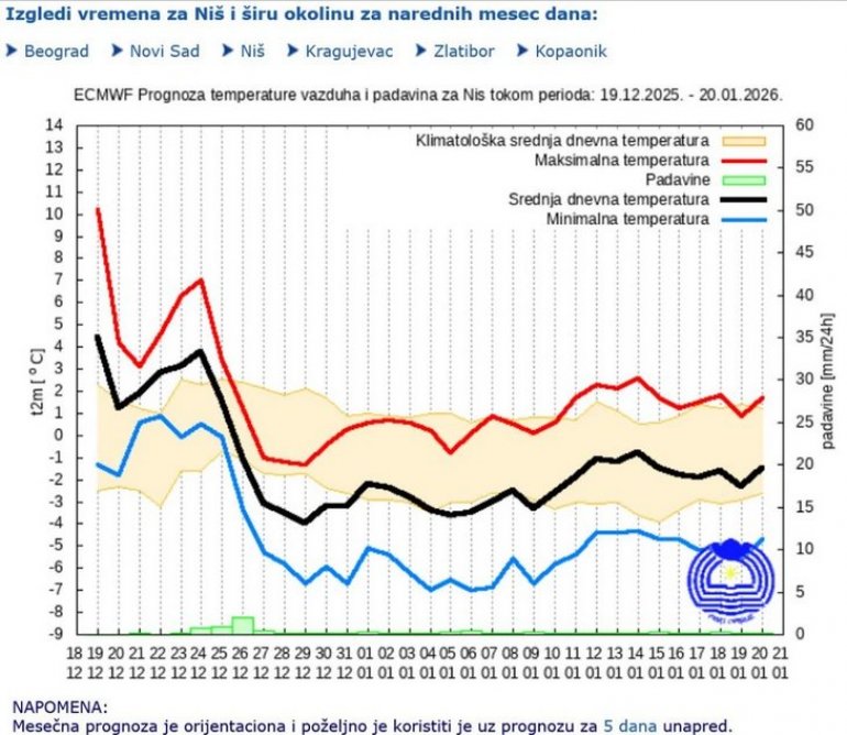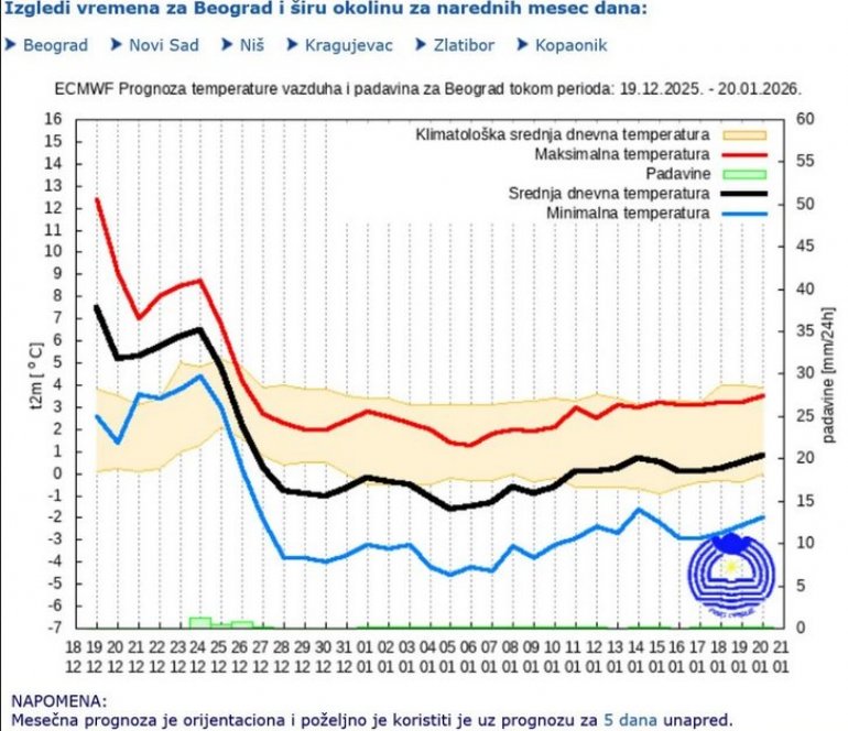 РХМЗ УПРАВО ОБЈАВИО НАЈНОВИЈУ ПРОГНОЗУ ДО КРАЈА ЈАНУАРА: Температуре падају и до минус 15 (ГРАФИКОН)