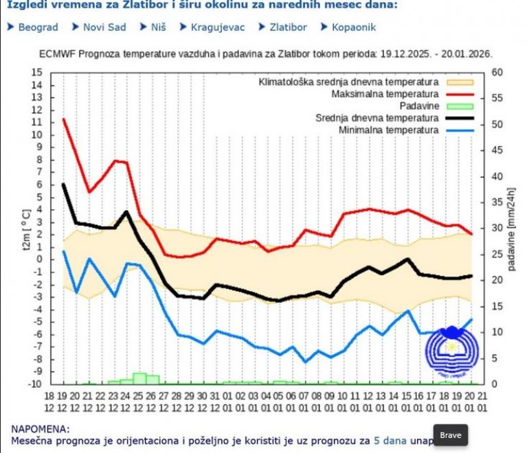 И графикон РХМЗ-а показује да је пред нама све хладније време, као и да ће на планинама температура ићи и до -15 степени у јануару. Такође, оно што је занимљиво јесте огромна осцилација, односно пад температуре за само 4 дана у децембру, па делује као да се на графикону направила "рупа".