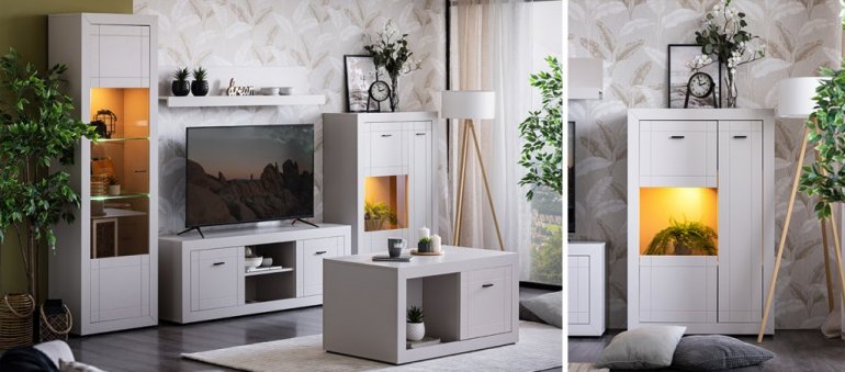 Елементи колекције WARWICK, израђени у елегантној комбинацији кашмир декора и кашмир мат фолије, представљају савршен спој модерног дизајна и класичне естетике. Витрина из система елемената WARWICK нуди практично решење за организован простор за одлагање – представља комбинацију застакљених, затворених и отворених опција. Унутрашње полице распоређене су тако да максимално искористе простор и задовоље свакодневне потребе домаћинства. Додатна погодност јесте та што поједини елементи имају могућност уградње расвете, која доприноси топлијој атмосфери и тиме додатно истиче декоративне елементе попут вазе за цвеће или подне лампе