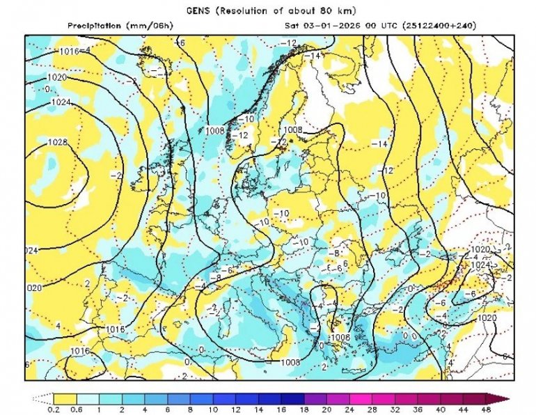 - Прорачуни модела се и даље јако разликују за период од 30.12. када неки од њих виде промену упадног угла хладног ваздуха уз могућност формирања циклона над Јадраном те би тада и код нас уследило јаче захлађење уз снег. За разлику од њих други модели ту могућност виде почетком 2026. тако да би свакако захладило, али о снази тог захлађења и потенцијалном снегу је још рано говорити. За сада само стоји процена да тренутно има великих изгледа да Божић по Јулијанског календару дочекамо уз озбиљнију хладноћу и снег - најавио је Чубрило.