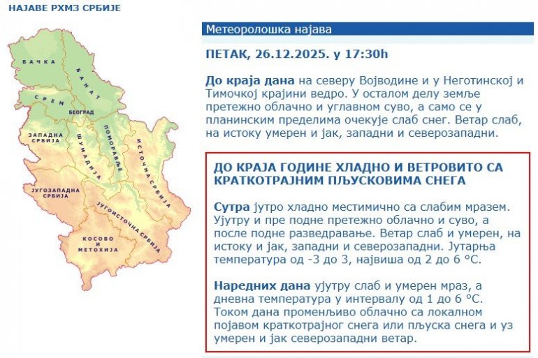 - Дo краја дана на северу Војводине и у Неготинској и Тимочкој крајини ведро. У осталом делу земље претежно облачно и углавном суво, а само се у планинским пределима очекује слаб снег. Ветар слаб, на истоку умерен и јак, западни и северозападни.
