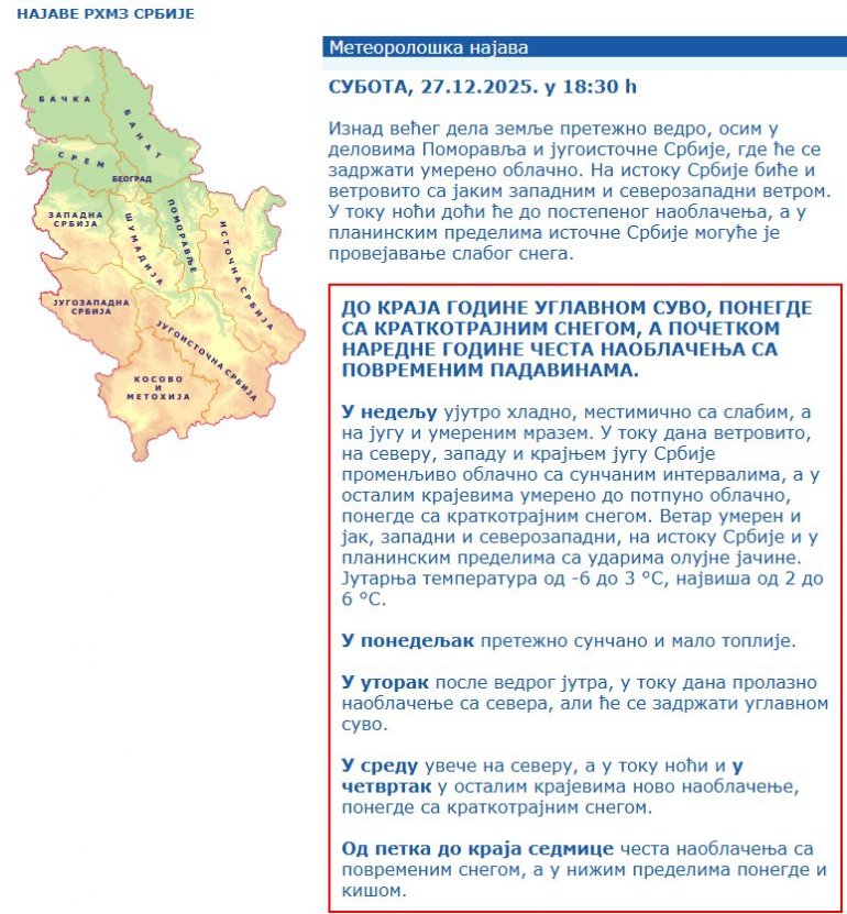 ДО КРАЈА ГОДИНЕ УГЛАВНОМ СУВО, ПОНЕГДЕ СА КРАТКОТРАЈНИМ СНЕГОМ, А ПОЧЕТКОМ НАРЕДНЕ ГОДИНЕ ЧЕСТА НАОБЛАЧЕЊА СА ПОВРЕМЕНИМ ПАДАВИНАМА.
