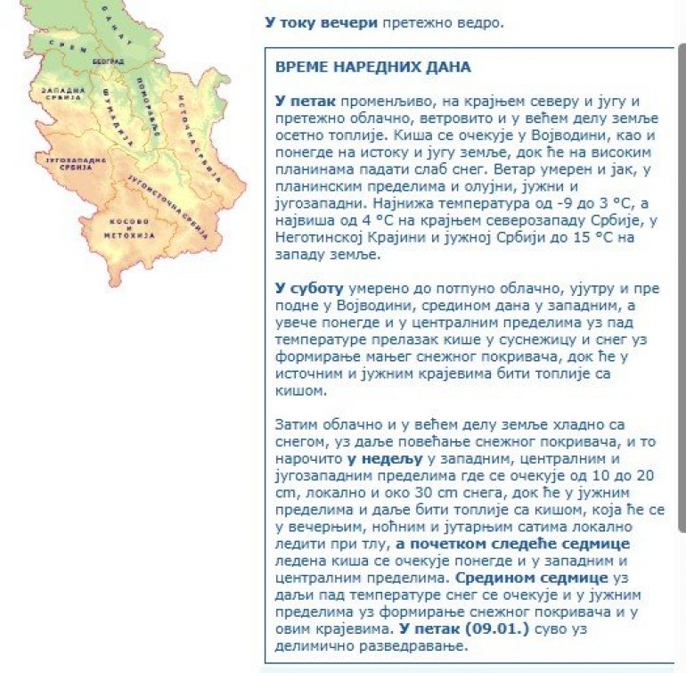 Затим облачно и у већем делу земље хладно са снегом, уз даље повећање снежног покривача, и то нарочито у недељу у западним, централним и југозападним пределима где се очекује од 10 до 20 cm, локално и око 30 cm снега, док ће у јужним пределима и даље бити топлије са кишом, која ће се у вечерњим, ноћним и јутарњим сатима локално ледити при тлу, а почетком следеће седмице ледена киша се очекује понегде и у западним и централним пределима. Средином седмице уз даљи пад температуре снег се очекује и у јужним пределима уз формирање снежног покривача и у овим крајевима. У петак (09.01.) суво уз делимично разведравање. - стоји на сајту РХМЗ.