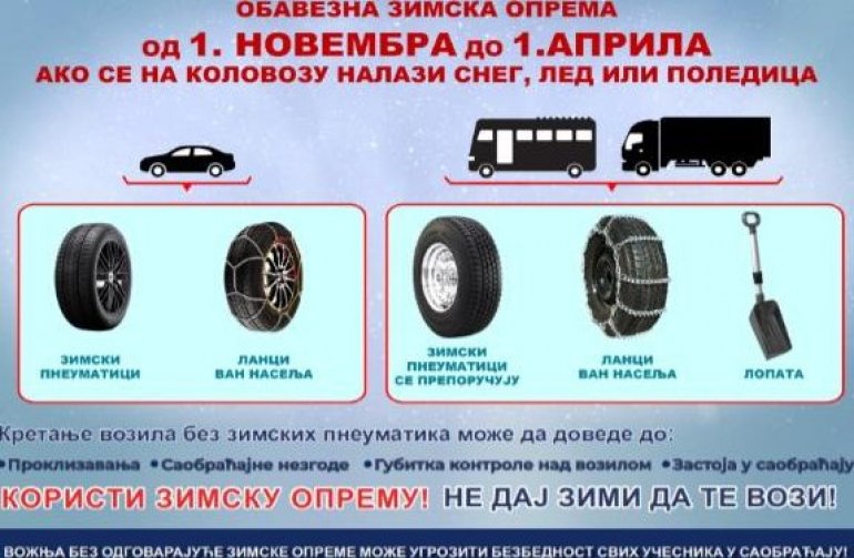 ЈП „Путеви Србије“ апелује на све учеснике да не крећу на пут без обавезне зимске опреме, јер се данас на истоку и југоистоку Србије очекује појава кише која ће се ледити на тлу, док се на подручју северне, западне, централне и југозападне Србије после подне и увече очекује интензивирање снежних падавина и повећање висине снежног покривача за 10 до 15 цм, локално и више.