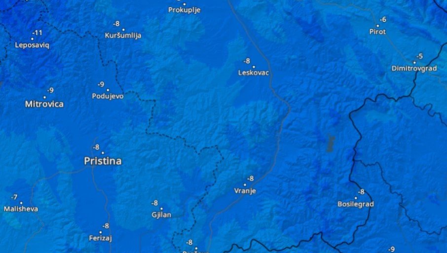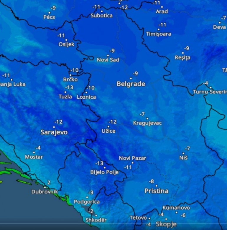 Предстојећа ведра ноћ над снегом покривеним подручјима условиће снажно хлађење, па ће минималне температуре у ноћи ка петку бити веома ниске, од -6 до -12 степени, док би на југозападу Србије, посебно у околини Прибоја где ће температура пасти до чак -16 степени.