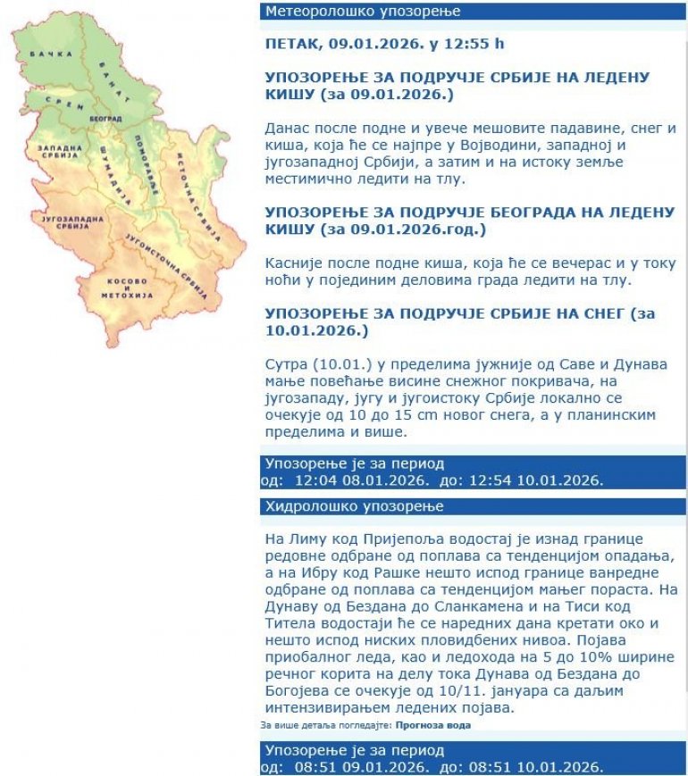 РЕПУБЛИЧКИ хидрометеоролошки завод (РХМЗ) издао је упозорење за подручје Србије на ледену кишу данас после подне и увече, наводећи да ће се мешовите падавине, снег и киша, најпре у Војводини, западној и југозападној Србији, а затим и на истоку земље местимично ледити при тлу.