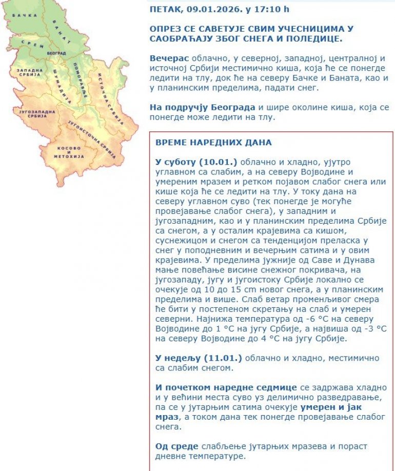У суботу (10.01.) облачно и хладно, ујутро углавном са слабим, а на северу Војводине и умереним мразем и ретком појавом слабог снега или кише која ће се ледити на тлу. У току дана на северу углавном суво (тек понегде је могуће провејавање слабог снега), у западним и југозападним, као и у планинским пределима Србије са снегом, а у осталим крајевима са кишом, суснежицом и снегом са тенденцијом преласка у снег у поподневним и вечерњим сатима и у овим крајевима. У пределима јужније од Саве и Дунава мање повећање висине снежног покривача, на југозападу, југу и југоистоку Србије локално се очекује од 10 до 15 cm новог снега, а у планинским пределима и више. Слаб ветар променљивог смера ће бити у постепеном скретању на слаб и умерен северни. Најнижа температура од -6 °С на северу Војводине до 1 °С на југу Србије, а највиша од -3 °С на северу Војводине до 4 °С на југу Србије.