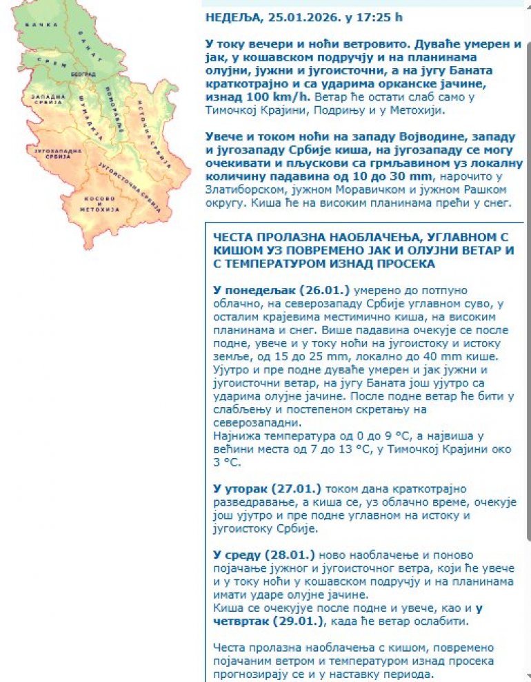 У понедељак (26.01.) умерено до потпуно облачно, на северозападу Србије углавном суво, у осталим крајевима местимично киша, на високим планинама и снег. Више падавина очекује се после подне, увече и у току ноћи на југоистоку и истоку земље, од 15 до 25 mm, локално до 40 mm кише.