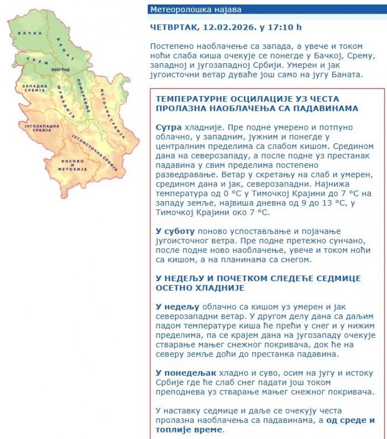 - Постепено наоблачење са запада, а увече и током ноћи слаба киша очекује се понегде у Бачкој, Срему, западној и југозападној Србији. Умерен и јак југоисточни ветар дуваће још само на југу Баната.