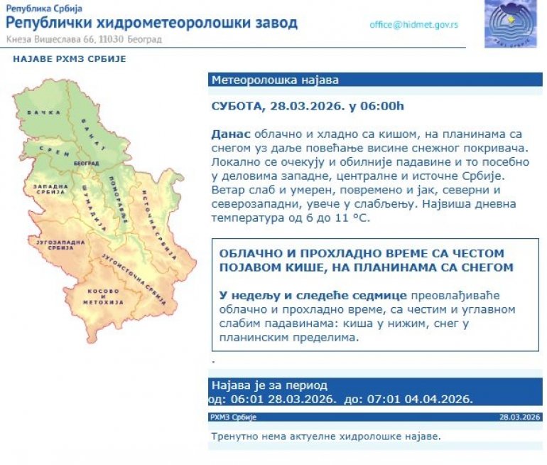 У недељу и следеће седмице преовлађиваће облачно и прохладно време, са честим и углавном слабим падавинама: киша у нижим, снег у планинским пределима.