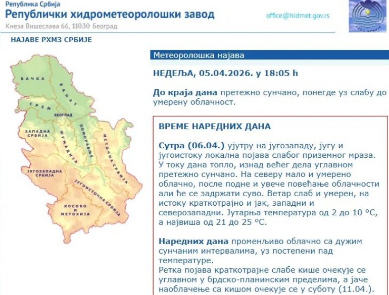 - Сутра (06.04.) ујутру на југозападу, југу и југоистоку локална појава слабог приземног мраза. У току дана топло, изнад већег дела углавном претежно сунчано. На северу мало и умерено облачно, после подне и увече повећање облачности али ће се задржати суво. Ветар слаб и умерен, на истоку краткотрајно и јак, западни и северозападни. Јутарња температура од 2 до 10 °С, а највиша од 21 до 25 °С - најављује РХМЗ.