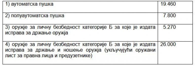 Према овом решењу порез на аутоматску пушку износи 19.460 динара, на полуаутоматску 7.800, на оружје за личну безбедност категорије Б за које је издата исправа за држање оружја 5.270 динара а за оружје за личну безбедност категорије Б за које је издата исправа за држање и ношење оружја, укључујући оружани лист за правна лица и предузетнике, 26.000 динара.