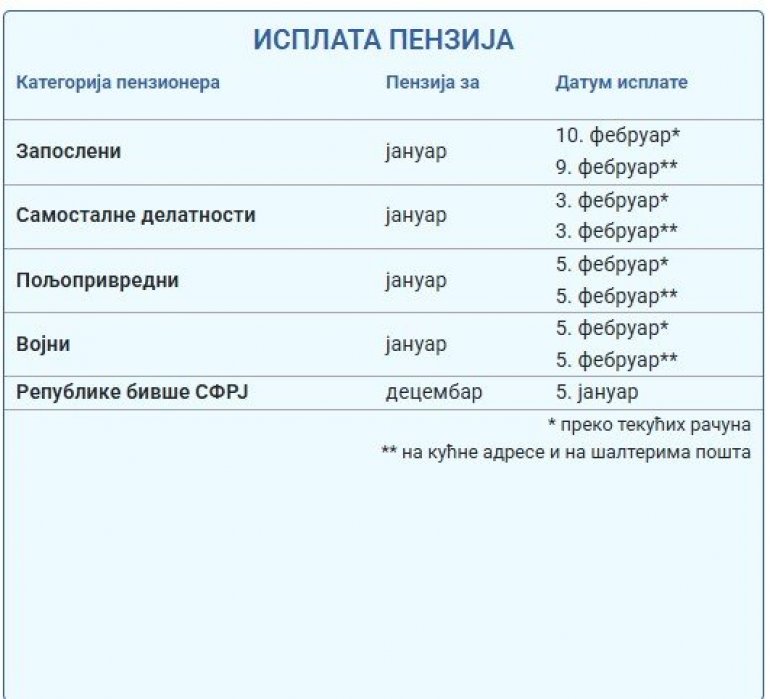 Последњи ће пензије добити корисници из категорије запослених, па ће онима који их добијају преко текућих рачуна чекови почети да пристижу 9. јануара а пензионерима из ове, иначе најбројније категорије, који примања добијају на кућу или на поштанским шалтерима, 10. фебруара.