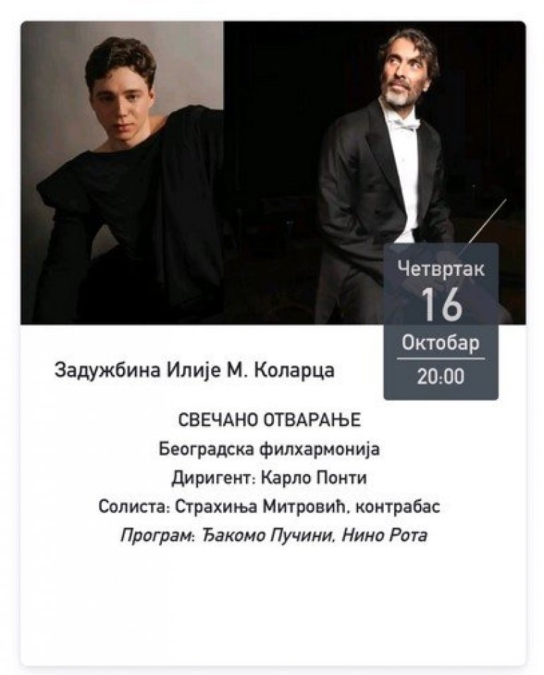 16. октобар, Коларац – Отварање: Београдска филхармонија, диригент Карло Понти, солиста Страхиња Митровић (Пучини, Рота)
