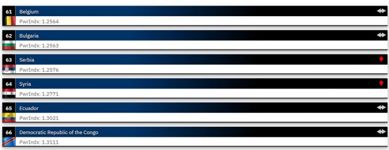 Према овом рангирању, Хрватска се налази на 74. месту, док је Србија рангирана на 63, а Босна и Херцеговина на 132. месту. Уз три водеће силе, у самом врху листе налазе се још Индија, Јужна Кореја, Уједињено Краљевство, Јапан, Француска, Турска и Италија. Занимљиво је да неке од тих земаља имају знатно мањи број активних војника од држава које су рангиране ниже, што додатно потврђује да сама бројност није пресудан критеријум војне снаге. Јапан, на пример, дугује високу позицију снажној морнарици и ваздушним снагама, укључујући једну од најмодернијих флота разарача, савремене борбене авионе и напредне противракетне системе.