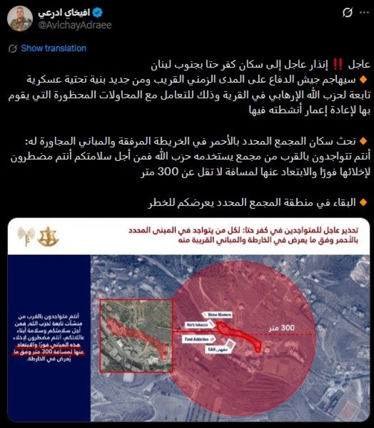 - Израелска војска ће ускоро, поново, нападнути војну инфраструктуру терористичког Хезболаха у селу, како би се обуздали забрањени покушаји обнове њихових активности тамо - написао је колонијал Авићај Адраи на X, уз мапу очекиваних циљева.