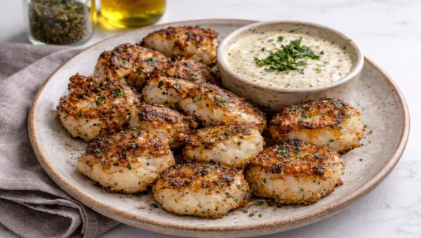 У чинији помешајте мајонез, јогурт, лимунов сок и кору, зачинско биље и бели лук. Посолите и побиберите по укусу. Послужите топле рибље залогаје уз освежавајући прелив.