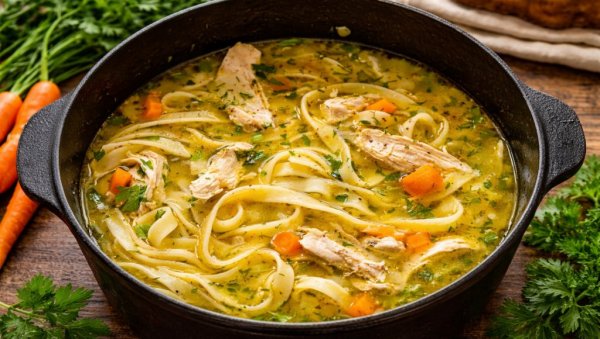 ОВА супа је прави класик: бистра, хранљива и пуна укуса. Комбинација домаћих резанаца, свежег поврћа и нежног пилећег меса чини савршен ручак или лагану вечеру.