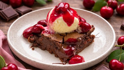 За сос: Вишње кратко прокувајте. Додајте густин помешан са водом и мешајте док се не згусне. Брауни послужите уз куглу сладоледа и прелијте топлим сосом од вишања.