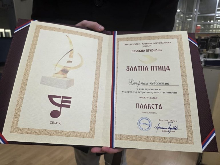НОВОСТИ ДОБИТНИК ЗЛАТНЕ ПТИЦЕ: Савез естрадно-музичких уметника Србије доделио нашој компанији престижно признање (ФОТО)