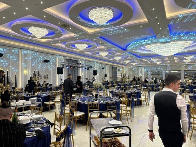У сали доминирају плаво-злати тонови, на плафону су свуда били кристални лустери, а на сваком тањиру налазила се посебна порука и мали поклон.