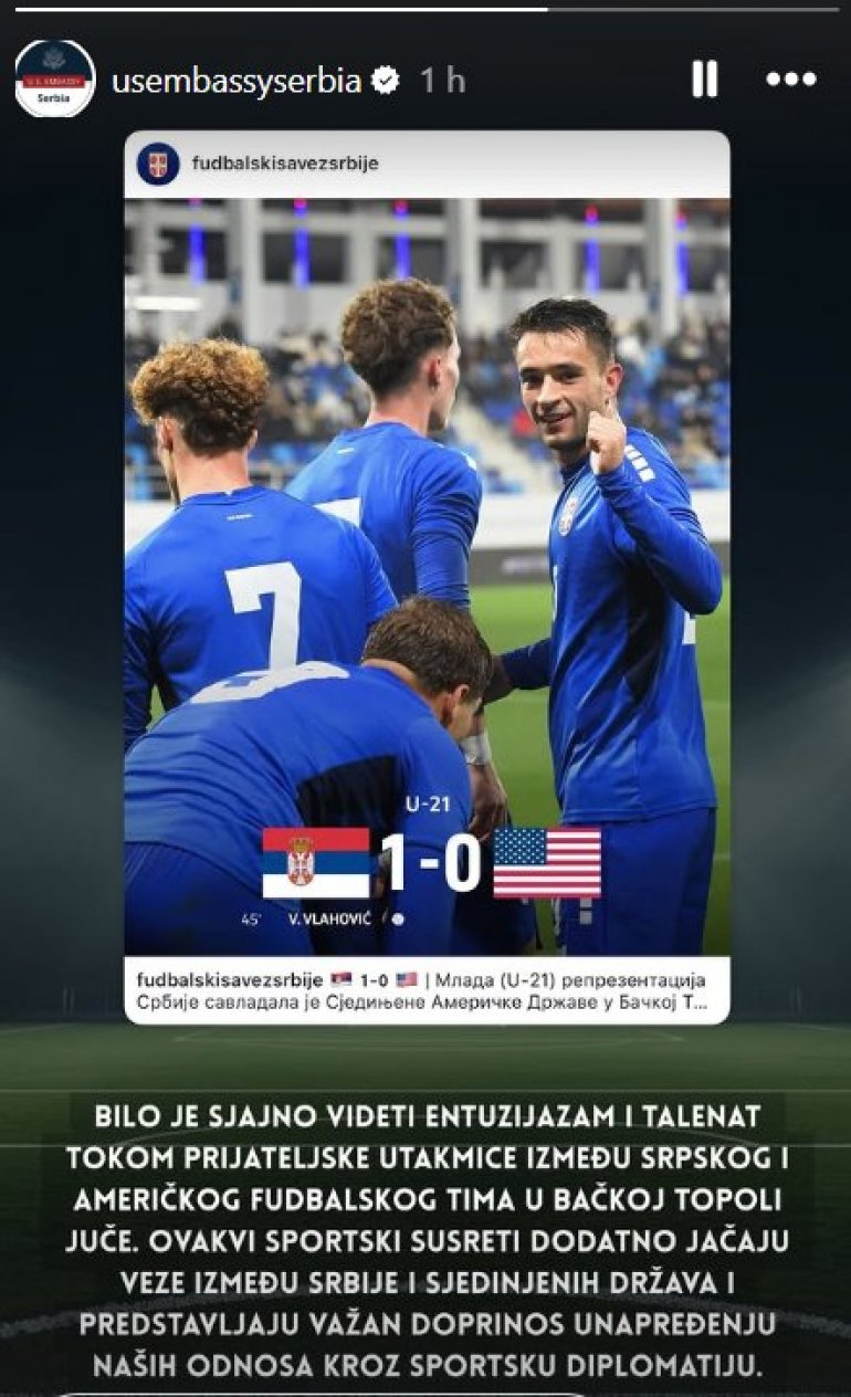 - Било је сјајно видети ентузијазам и таленат током пријатељске утакмице између српског и америчког фудбалског тима у Бачкој Тополи јуче. Овакви сусрети додатно јачају везе између Србије и Сједињених Америчких Држава и представљају важан допринос унапређењу наших односа кроз спортску дипломатију - наводи се на Инстаграм страници Америчке амбасаде у Београду.