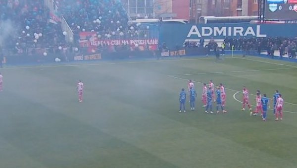 Већ на старту дуела инцидент у боксу, где су смештени навијачи Црвене звезде, морала је и полиција да интервенише. Не види се ништа малтене од дима испред делија.