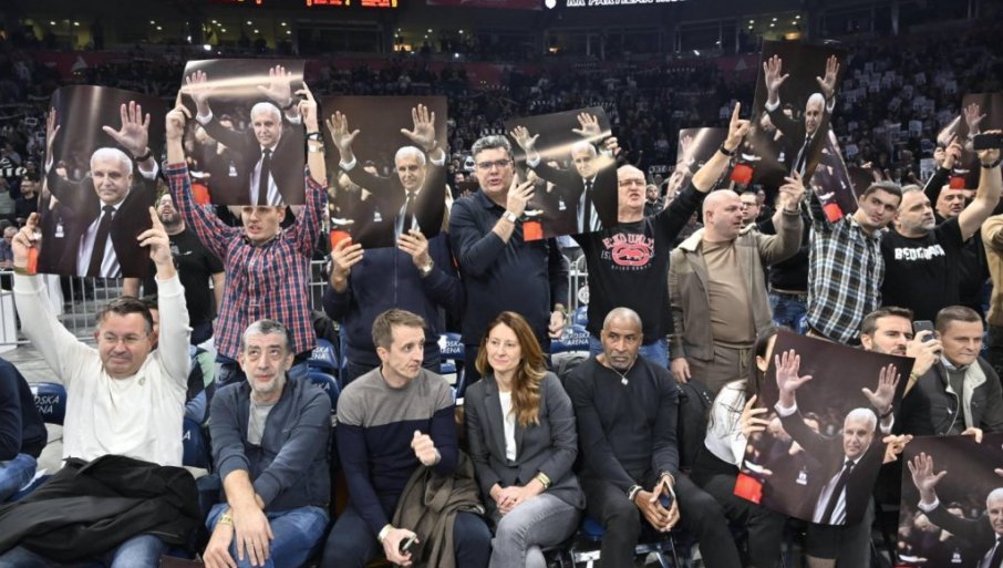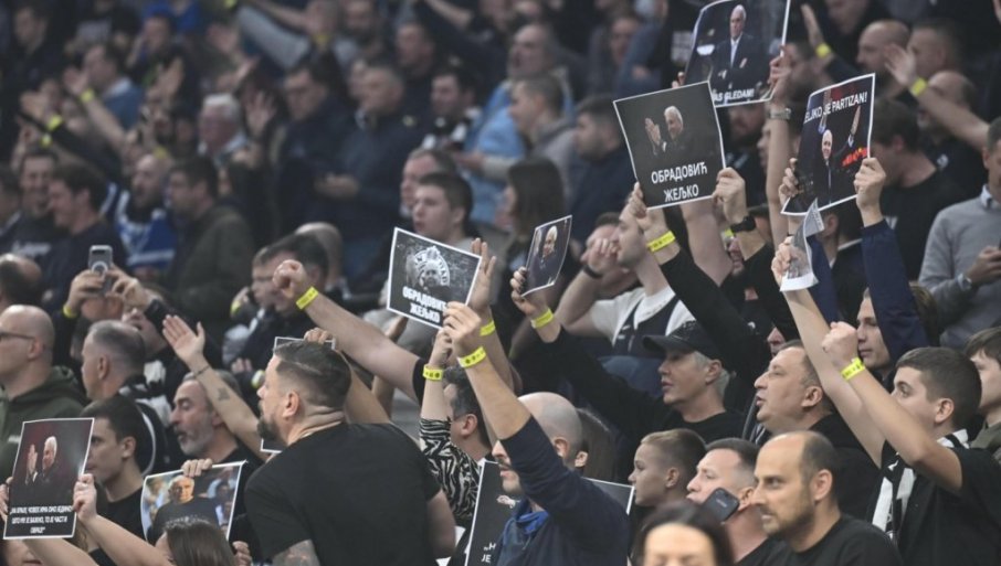 20.10 - Кошаркаши Партизана извиждани су пред излазак на терен, а све на трибинама у знаку је доскорашњег тренера Обрадовић Жељка. Навијачи скандирају име популарног тренера...