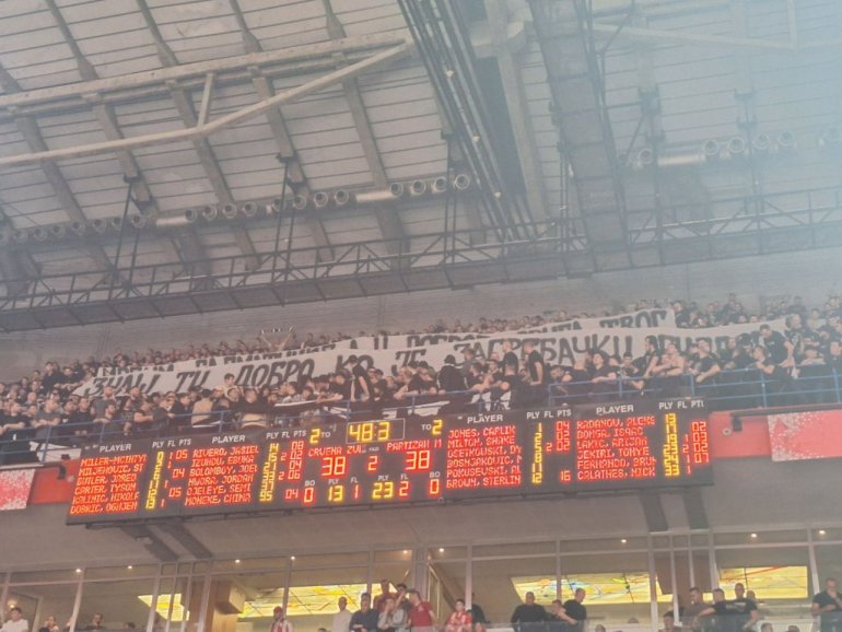 Уједно, овом приликом су делије једним транспарентом разбеснеле фанове црно-белих којих такође, додуше у далеко мањем броју, има у Београдској арени.