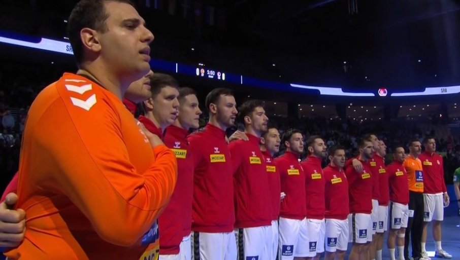 Српски рукометаши током химне пред меч са Шпанијом / Screenshot: RTS