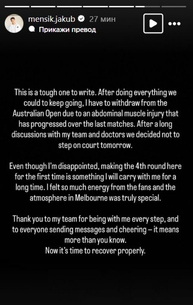 Хвала мом тиму што је био уз мене на сваком кораку, и свима који шаљу поруке и навијају – то ми значи више него што мислите. Сада је време за прави опоравак - написао је Меншик на друштвеним мрежама.