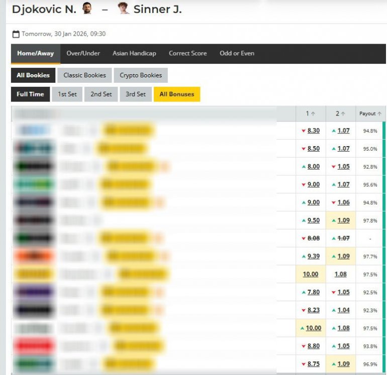 Квоте у кладионицама на меч Новак Ђоковић - Јаник Синер на Аустралијан опену 2026 / Screenshot