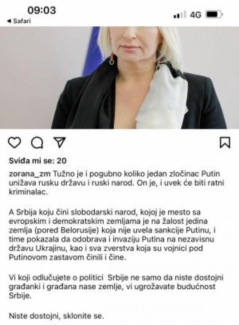 - А Србија коју чини слободарски народ, којој је место са европским и демократским земљама је на жалост једина земља (поред Белорусије) која није увела санкције Путину, и тиме показала да одобрава и инвазију Путина на независну државу Украјину, као и сва зверства која су војници под Путиновом заставом чинили и чине. Ви који одлучујете о политици Србије не само да нисте достојни грађанки и грађана насе земље, ви угрожавате будућност Србије.