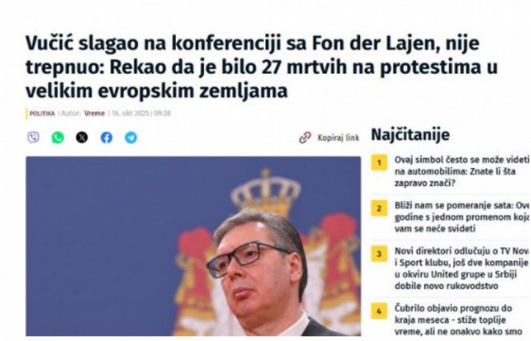Наиме, портал "Нова С" пустио је вест у којој су изнели неосноване тврдње да је председник Србије Александар Вучић слагао током обраћања на конференцији са Урсулом фон дер Лајен, објавивши текст са насловом "Вучић слагао на конференцији са Фон дер Лајен, није трепнуо: Рекао да је било 27 мртвих на протестима у великим европским земљама".