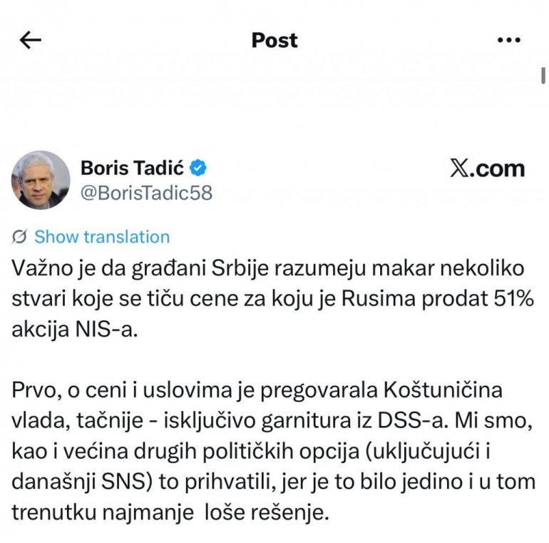 - Важно је да грађани Србије разумеју макар неколико ствари које се тичу цене за коју је Русима продат 51% акција НИС-а.