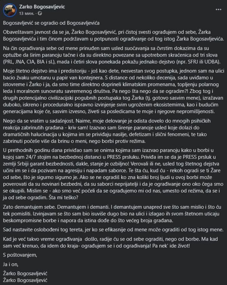 Обавештавам јавност да се ја, Жарко Богосављевић, при чистој свести ограђујем од себе, Жарка Богосављевића и тим чином подржавам у потпуности ограђивање од тог истог Жарка Богосављевића. На чин ограђивања себе од мене принуђен сам услед суочавања са чврстим доказима да су оптужбе да ширим параноју тачне и да су директно повезане са употребом скраћеница од три слова (ПРЛ, ЈНА, ЦИА, БИА и сл.), мада и четири слова понекада покажу једнако дејство (нпр. СФРЈ или УДБА). Моје штетно дејство има и предисторију - још као дете, несвестан свог поступка, једном сам на улици бацио жваку умотану у папир ван контејнера. С дистанце од неколико деценија, сада увиђамо у истовреме и Жарко и ја, да смо тиме директно допринели климатским променама, топљењу поларног леда и моралном суноврату савременог друштва. Па него шта него да се оградим?! Због тог и других потенцијално цивилизацијски погубних поступака тог Жарка (тј. готово сасвим мене), изражаван дубоко, искрено и процедурално исправно извињење свим угроженим екосистемима, као и будућим генерацијама које ће, сасвим извесно, живети са последицама те моје и његове непромишљености. Него да се вратим у садашњост. Наиме, моје деловање је одиста довело до многих психичких реакција забринутих грађана - крив сам! Изазвао сам ширење параноје услед које долази до драматичних халуцинација у којима им се привиђају насиље, дефетизам и слични феномени, те тако забринути почеше више да брину о мени, него борби против режима.