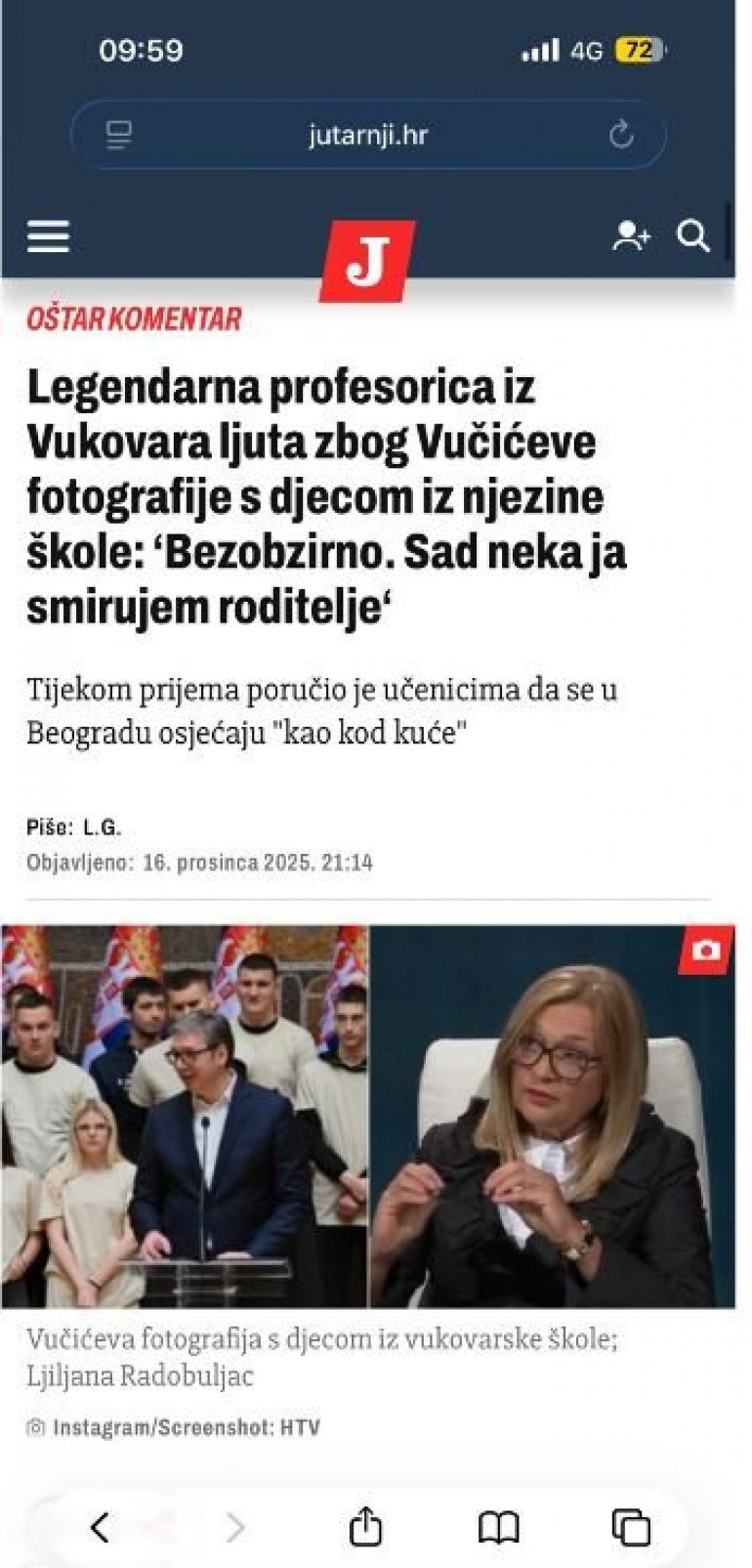 - Док њихови вршњаци већ годину дана немају нормалну наставу, док ходају и пешаче Србијом како би указали на безакоње, противуставност и тежак положај мислећих људи, док моје колеге у Србији стењу под теретом лудила, отказа и претњи, неко одлучи одвести ученике моје школе на пријем истом том Вучићу - рекла је за Јутарњи лист.