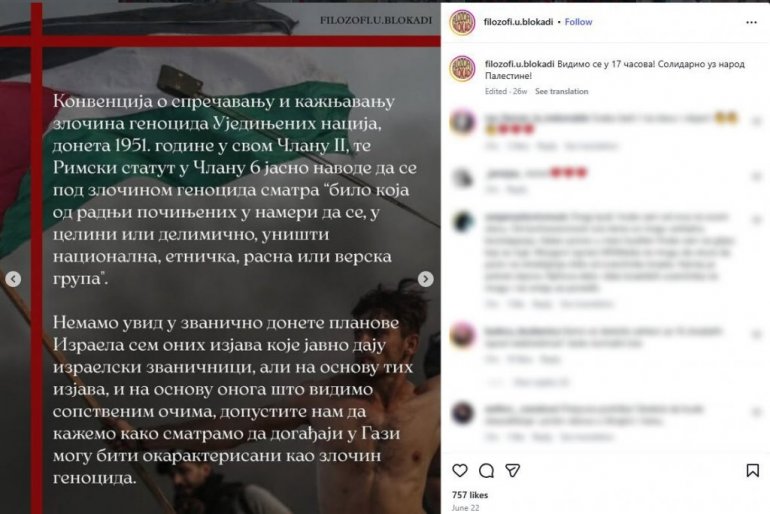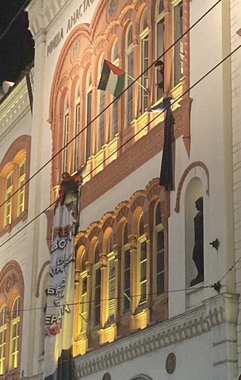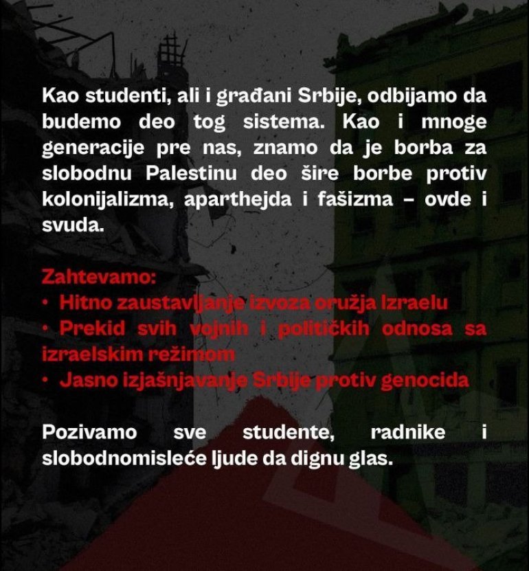 Ционизам – идеологија на којој почива израелски режим – јесте колонијална и насилна политика која десетлећима уништава животе Палестинаца. Када Скупштина Београда мења имена улица по жељи израелске амбасаде – улицу у Земуну назива по Теодору Херцлу, оцу идеје стварања јеврејске државе и оснивачу ционизма, то није „неутралан чин“ – то је политичка порука подршке окупацији. ... Као и многе генерације пре нас, знамо да је борба за слободну Палестину део шире борбе против колонијализма, апартхејда и фашизма – овде и свуда. Захтевамо: Прекид свих војних и политичких односа са израелским режимом. Јасно изражавање Србије против геноцида. Позивамо све студенте, раднике и слободномислеће људе да дигну глас.