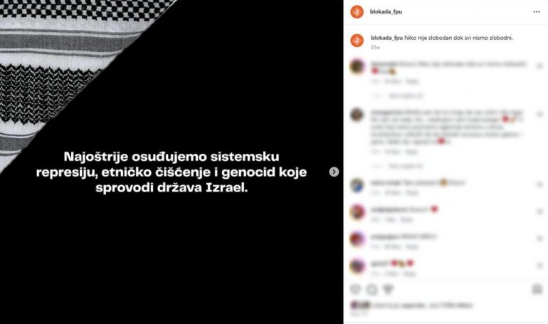 Најоштрије осуђујемо системску репресију, етничко чишћење и геноцид које спроводи држава Израел. Од оснивања државе Израел 1948. године, које је подразумевало принудно расељавање више од 700.000 људи, народ Палестине је континуирано изложен политици апартхејда и третману грађана другог реда. Од Газе, у којој се тренутно врши геноцид, до Западне обале и Источног Јерусалима, где људи свакодневно остају без домова и морају пролазити кроз војне контролне пунктове како би дошли до посла, јасно је да је време да се сваки облик угњетавања оконча.
