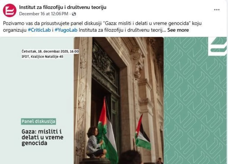 Позивамо вас да присуствујете панел дискусији „Газа: мислити и делати у време геноцида“ коју организују ЦритицЛаб и Yуголаб Института за филозофију и друштвену теорију. Дискусија је посвећена геноциду у Гази и улози академске заједнице у суочавању са овим насиљем.