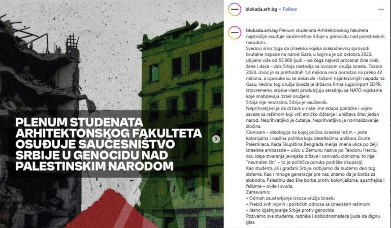 ИИ Пленум студената архитектонског факултета у блокади осуђује саучесништво Србије у геноциду над палестинским народом.