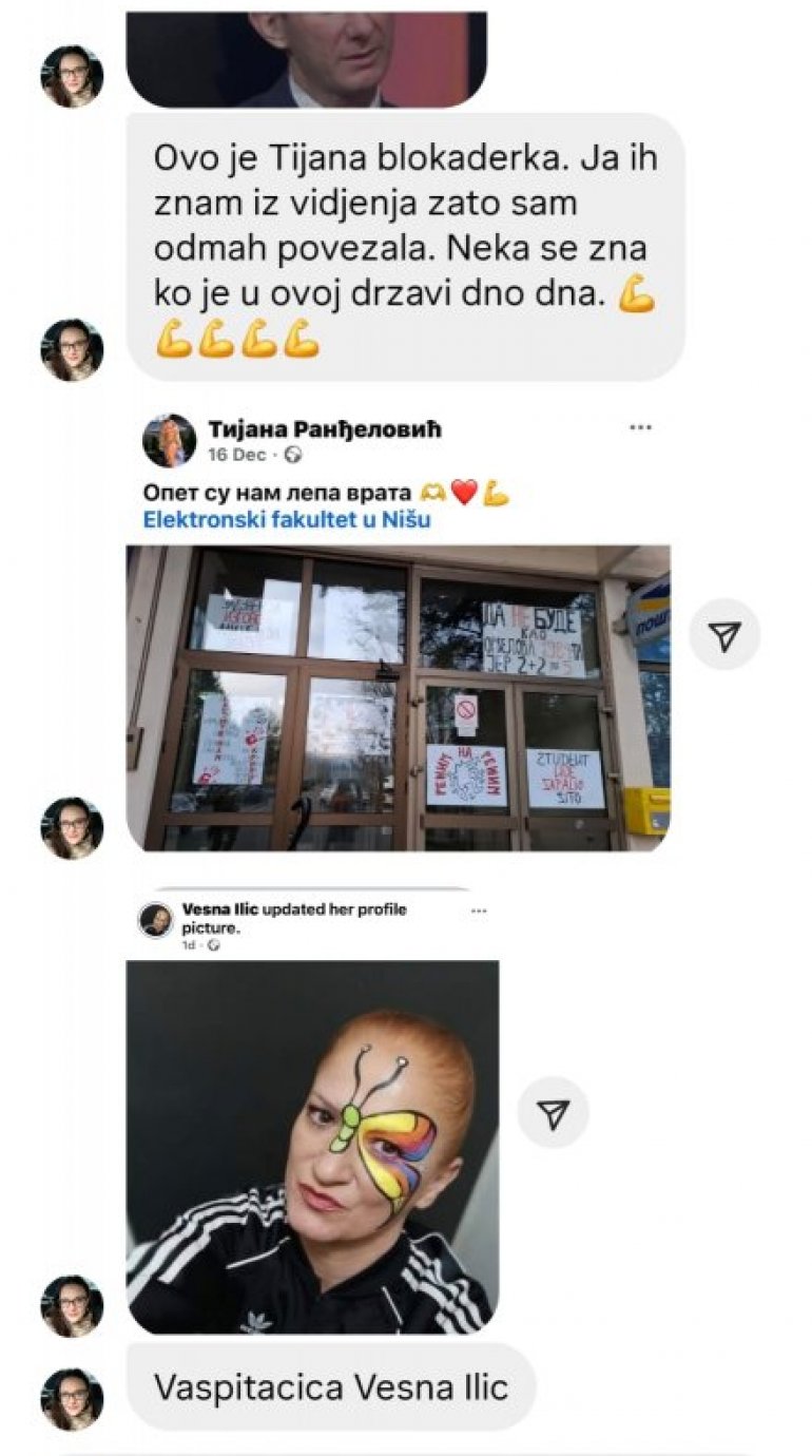 Она је на снимку са професорком Тијаном Ранђеловић са Електронског факултета која је уз деканку Наталију Јовановић са нишког Филозофског факултета била окосница блокада у овом граду.