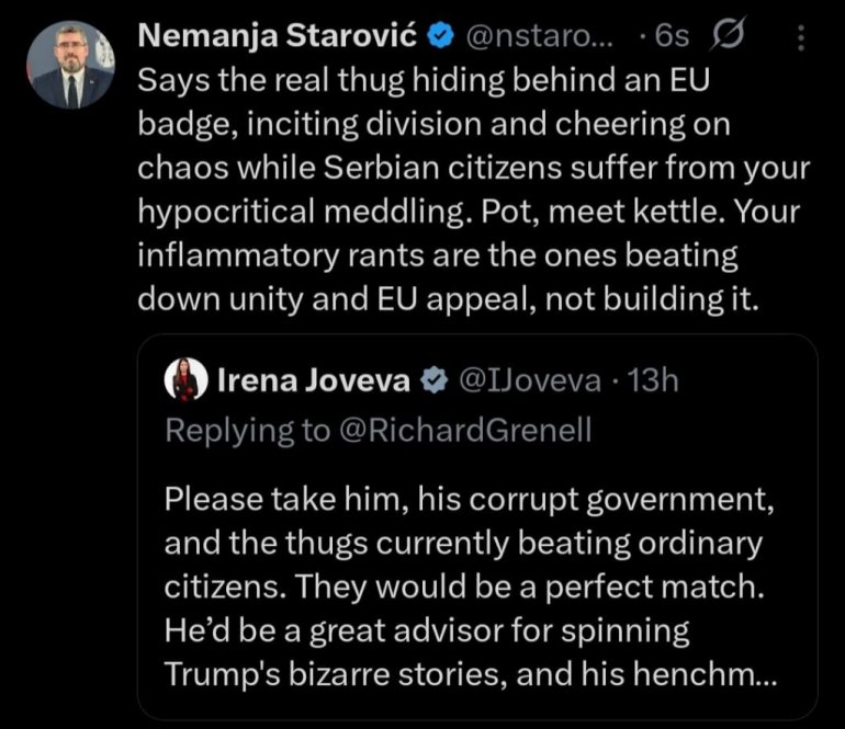МИНИСТАР за европске интеграције Немања Старовић одговорио је на друштвеној мрежи Икс чланици Европског парламента Ирени Јовевој.