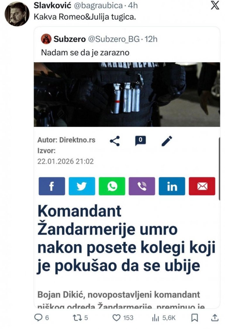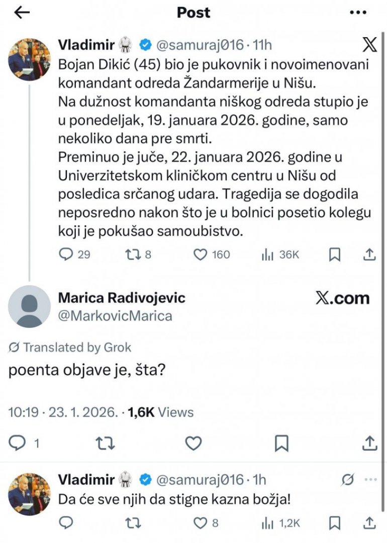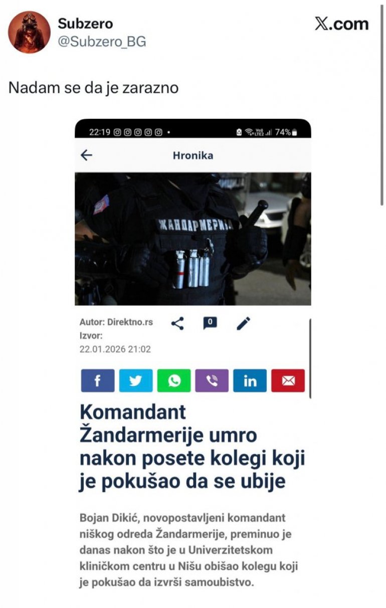 Наиме, они данас на својим налозима на друштвеним мрежама сеире и радују се над смрћу Бојана Дикића, новопостављеног команданта нишког одреда Жандармерије, који је синоћ преминуо од последица срчаног удара.